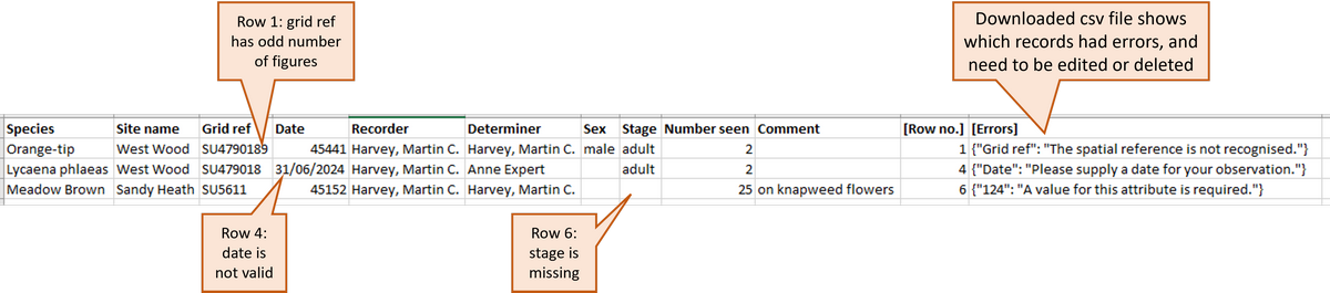 If the import process encounters any records that cannot be imported, you will see a message telling you how many records had problems, and there will be a button "Download the rows that had errors". Click on that button and you will be able to download a csv file that shows the records that caused problems, including extra column that gives details of what the errors were. Examples of errors that would cause the import to fail are incorrectly formatted grid references, or incorrect dates (such as 31 June 2024, which doesn't exist), or missing information in one of the required fields (e.g. if a stage term has been left blank, rather than being set to "not recorded").